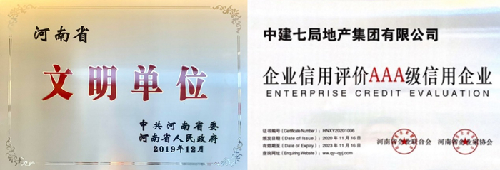 作为中国建筑第七工程局有限公司旗下地产开发服务业务的唯一平台公司,中建七局地产集团历经淬火磨砺,十余载砥砺前行,先后荣膺河南省文明单位、河南省首批“AAA”信用评级企业等称号,获得全国青年岗位能手、河南省青年文明号、河南省五四红旗团委等荣誉,并连续荣获河南省本土10强房企。