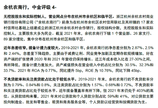 此外,近日,2022年中金固收给出余杭农商行的信用资质评级为4-。中金固收认为,余杭农商行股权结构分散,无控股股东和实际控制人,主要股东大多为民企。且近年息差收窄,拨备计提力度较大。2019-2021年,余杭农商行的净息差分别为 2.87%、2.5%和 2.44%,息差呈下降趋势,主要由于减费让利、同业竞争加剧及定期存款规模增加,好在资产端的扩张使得2020年和2021年营收仍保持增长。