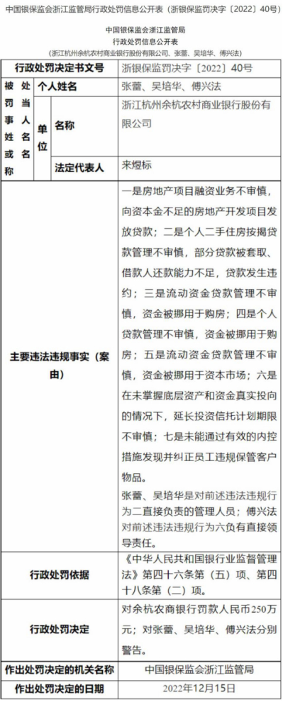 12月21日,中国银保监会官网公布的浙江监管局行政处罚信息公开表(浙银保监罚决字〔2022〕40号)显示,余杭农商行存在七则违法违规事实。