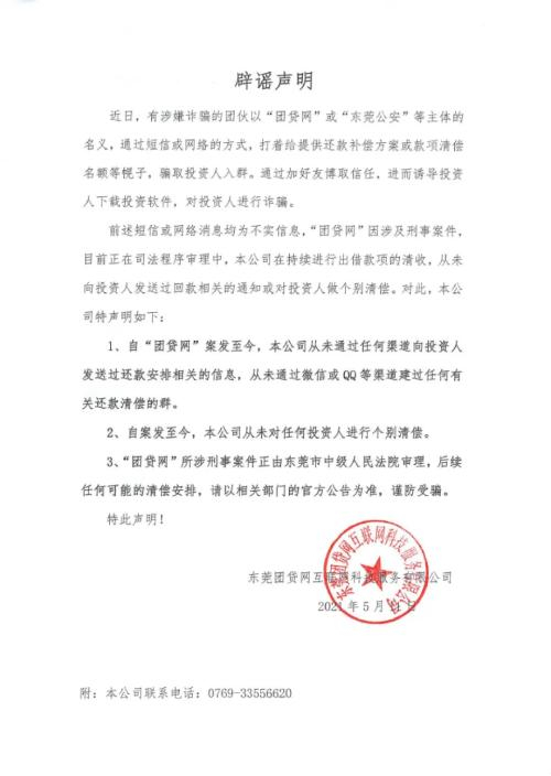 很快,团贷网就发布声明辟谣,并提醒团贷网投资人,谨防受骗。据声明称,自案发至今,团贷网从未对任何投资人进行个别清偿。并表示团贷网所涉刑事案件还在法院审理中,后续任何可能的清偿安排,以相关部门的官方公告为准。