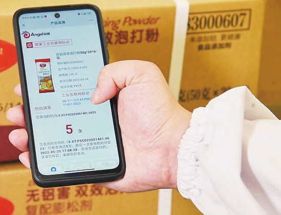 “工业互联网标识‘藏’在产品外包装上的二维码里。”安琪酵母股份有限公司信息中心高级工程师韩陈说。每个产品外包装纸箱经过一处特殊装置时,会被喷上一个二维码。掏出手机一扫,一款名为“无铝害双效泡打粉”的产品信息弹了出来,除生产批号、保质期、生产批次日期等常规信息外,“国家工业互联网标识”几个红字格外醒目,紧随其后的是一串数字和字母组成的代码。韩陈介绍,代码中的“88.311”代表宜昌,“88.311.3”代表安琪。
