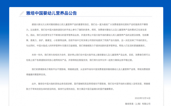 对于该项决定,雅培方面解释称,“过去数年,我们在中国大陆快速变化的市场上参与了激烈的竞争。然而,消费者对婴幼儿以及儿童营养产品的需求正在发生变化。因此,我们决定更专注于不断增长的医学营养品业务,并逐步停止中国大陆市场的婴幼儿和儿童营养产品的运营及销售,包括菁挚、恩美力、亲护、喜康宝、小安素等品牌。目前市场中已有多家公司很好地提供了同类产品与服务,这一决定反映了市场的变化。”