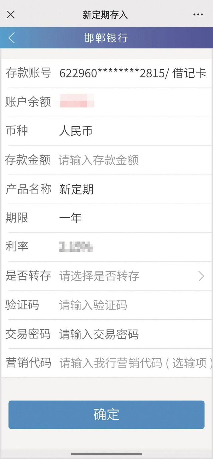 以新定期1年期存款为例,点击【办理】,查看存款介绍后根据页面提示选择银行卡、输入存款金额、选择是否转存、输入交易密码,点击“确定”,完成办理。