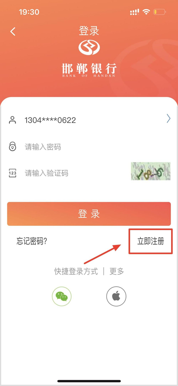 若您尚未开通邯郸银行手机银行,可点击【立即注册】(见图3红框),根据页面提示完成注册及添加银行卡操作。