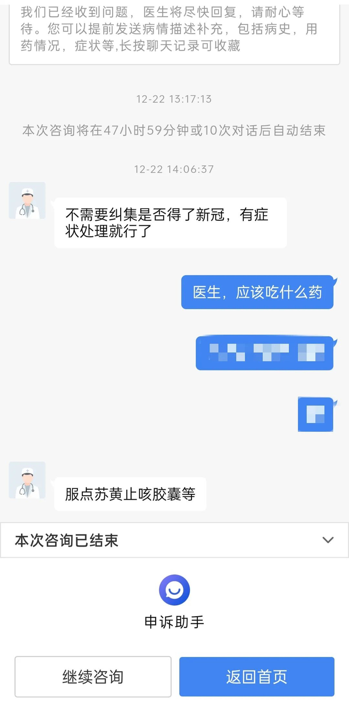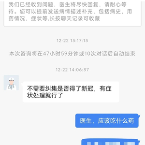 记者依照短信指引进入小程序,医生在对话框中回答:不要纠结是否得了新冠,有症状处理(对症治疗)就行了。医生还告诉记者,畏寒可能会有发热现象,这属于机体的反应。