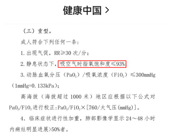 12月8日,国务院联防联控机制发布新冠病毒感染者居家治疗指南,指南提出,各地要加强基层医疗卫生机构常用药品、抗原检测试剂、指夹式血氧仪等储备,切实满足居家治疗人员用药和健康监测需求。连续几版的《新型冠状病毒肺炎诊疗方案》里写到,当指氧饱和度低于93%即为重症患者,需要进行辅助呼吸治疗。