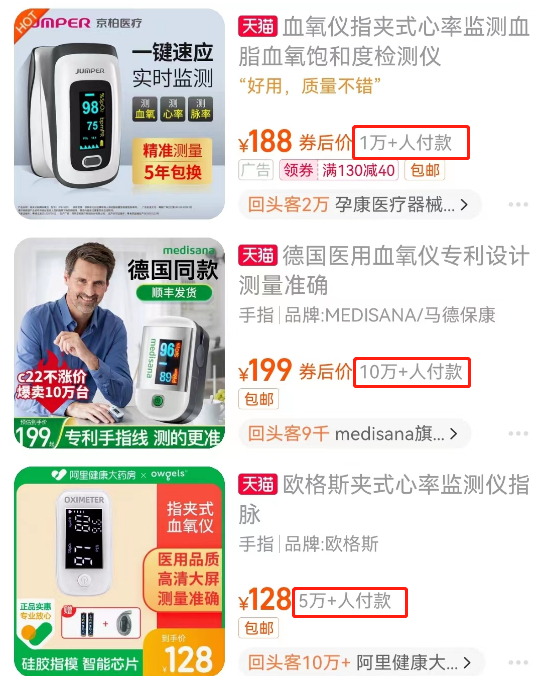 据京东健康数据,近一周(12.14-12.20)血氧仪品类的成交额同比增长61倍。北京商报记者搜索各大平台发现,除个别型号显示缺货外,大部分血氧仪产品目前可下单购买。