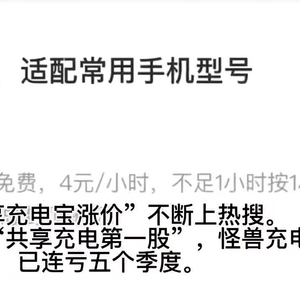 “共享充电宝涨价”每隔一段时间就会登上热搜,被消费者吐槽。从最初的1-2元/小时,发展到4元起步,甚至8元/小时,充电宝一路涨价,但作为“共享充电第一股”,怪兽充电已连亏五个季度。最近1年,怪兽充电的亏损总额已经达到了4.29亿元。截至发稿,怪兽充电股价为1.25美元/股,较发行价8.5美元/股跌去约85%。