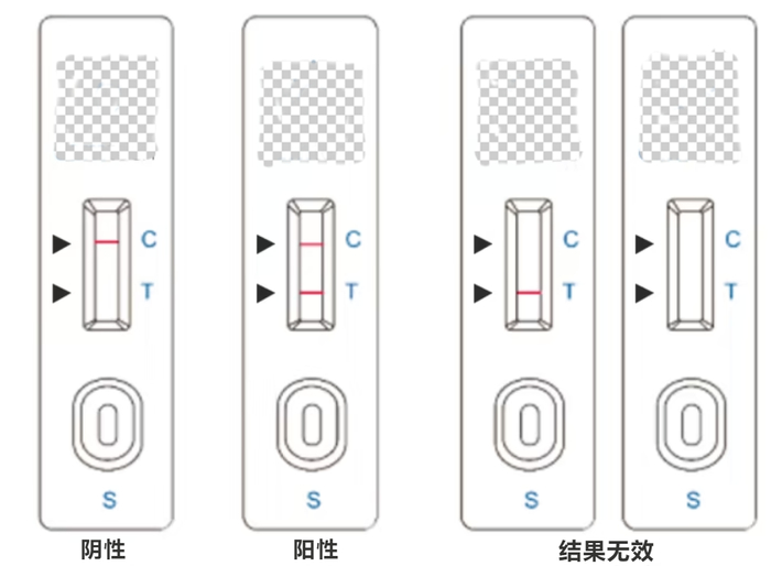 如果只在 C 这个地方出现一道红杠,则抗原阴性;如果在 C 和 T 都出现了红杠,也就是出现了两道红杠,不管颜色深浅,则抗原阳性;如果出现白板(未出现红杠),或只在 T 这里出现一道红杠,说明测试不成功、无效,要再测一次。