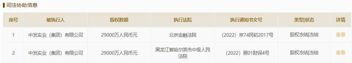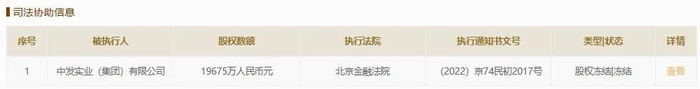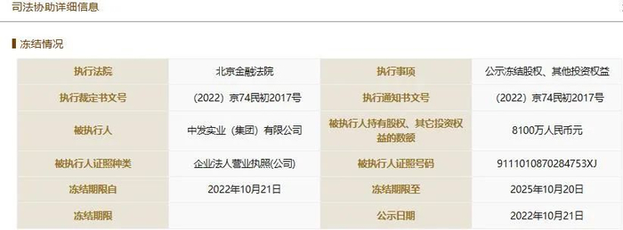 与此同时,中发集团持有的武汉小额信贷服务平台有限公司19675万元股权数额被冻结,执行法院为北京金融法院,执行裁定书文号为(2022)京74民初2017号,冻结期限为2022年10月9日至2025年10月8日。