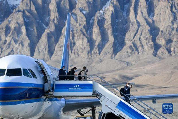 12月23日,在塔什库尔干红其拉甫机场,乘坐首航航班的旅客走下飞机。12月23日10时59分,一架自乌鲁木齐起飞的CZ5193次航班平稳降落在塔什库尔干红其拉甫机场,雪域高原帕米尔迎来首批“空中来客”。这标志着新疆首座高高原机场正式通航。为改善高原各族群众交通条件,2020年,作为国家“十三五”规划重点建设项目,投资超过16亿元的塔什库尔干机场启动建设。机场开通后,预计可满足年旅客吞吐量16万人次、货邮吞吐量400吨。新华社记者 丁磊 摄