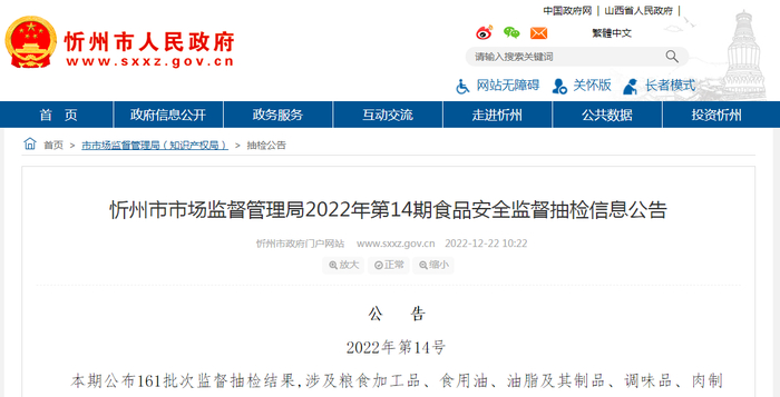 中国质量新闻网讯 近日,山西省忻州市市场监督管理局发布2022年第14期食品安全监督抽检信息公告 2022年第14号。