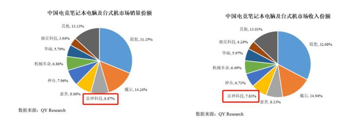 电竞笔记本电脑及台式机市场呈现出品牌效应显著、用户黏性高的行业特征,从而造就了市场高集中度的竞争格局。QY Research数据显示,2020年,雷神科技在国内电竞笔记本电脑和台式机市场销量份额 8.87%,位列第三,销量份额仅次于联想、戴尔。收入份额 7.83%,位列第四,收入份额仅次于联想、戴尔、惠普。
