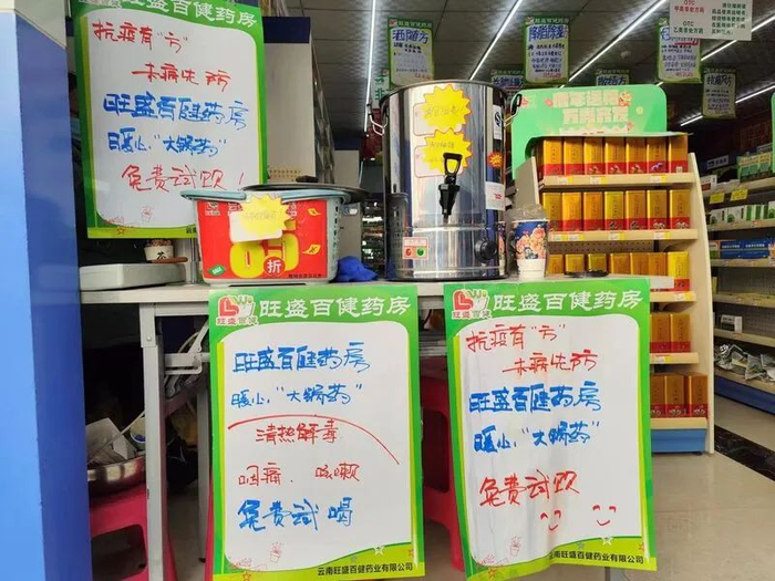 12月22日下午,在文山三鑫商贸城的旺盛百健药房门口,一口大锅冒着热气,飘出浓浓的中药味儿,“暖心‘大锅药’免费试饮”的标语贴在显眼的位置,不少市民前来咨询后,便接上一杯热气腾腾的“大锅药”带走。