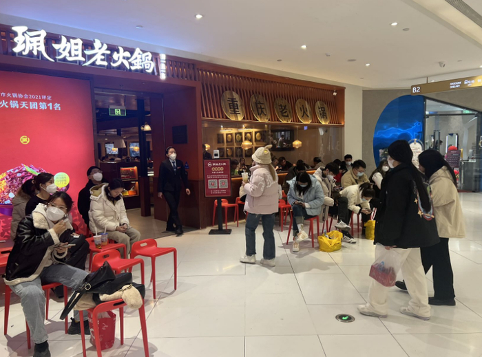 23日晚7点,位于荟聚购物中心的怂重庆火锅厂里也已经坐满,来晚的人同样需要排号等位。“现在中桌排了16桌,大桌有7桌。”店里工作人员说,自从商场取消查验48小时核酸阴性证明以来,最近几天生意越来越红火,门店的微信粉丝群里也有不少顾客线上预约。