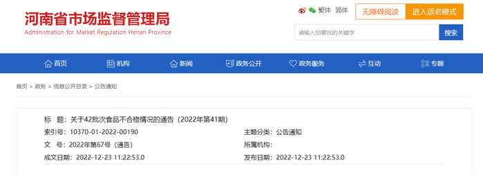 中国质量新闻网讯 2022年12月23日,河南省市场监督管理局网站发布关于42批次食品不合格情况的通告(2022年第41期)。