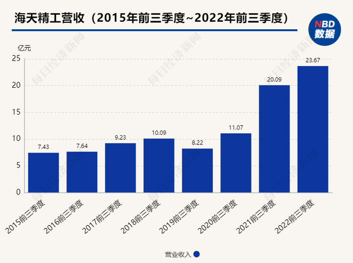 数据显示,2021年同期,海天精工营收20.09亿元,同比增81.53%;归属上市公司股东净利润2.63亿元,同比增193.44%。