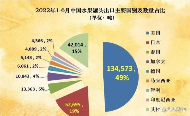 涅槃重生的罐头厂商成功得到国际市场认可。海关数据显示,仅2022年前两个季度,中国水果罐头出口量在154.77万吨,同比上升15.41%。其中美国作为我国最大进口方。2021年接收了约41%的国产水果罐头,很大比例都是黄桃罐头。