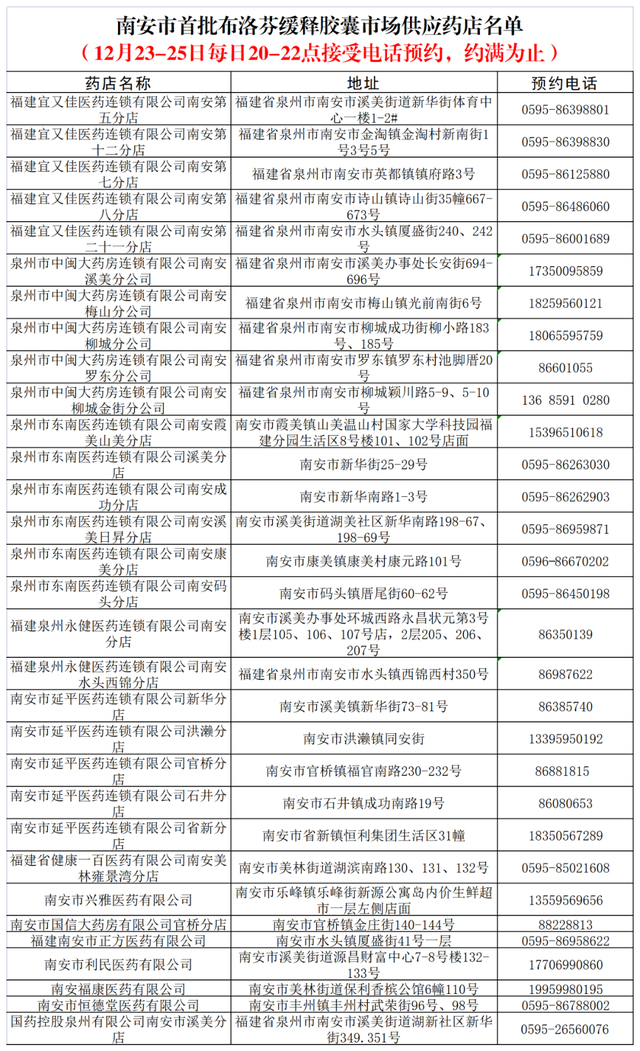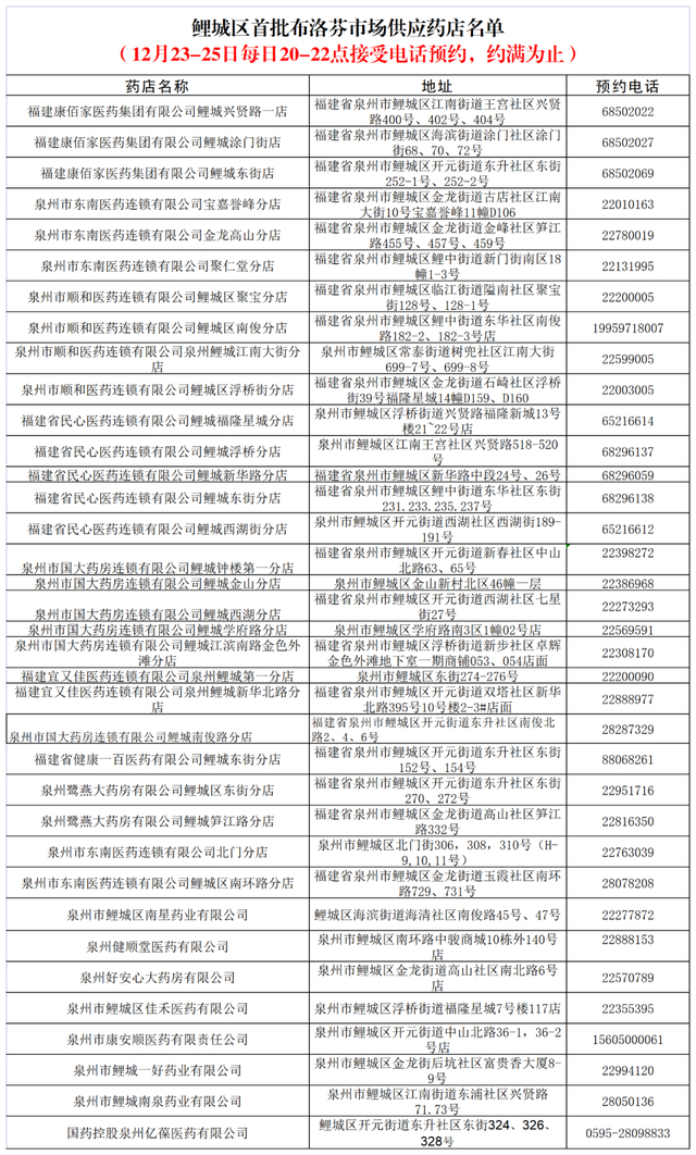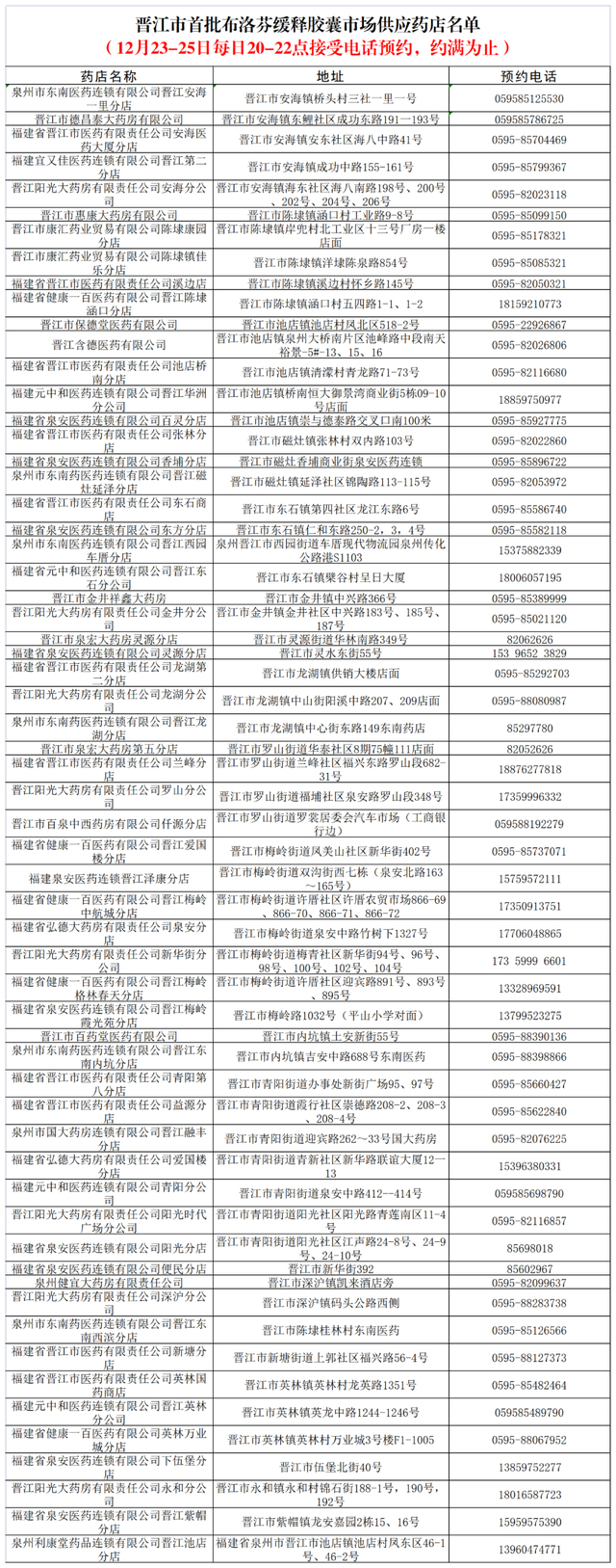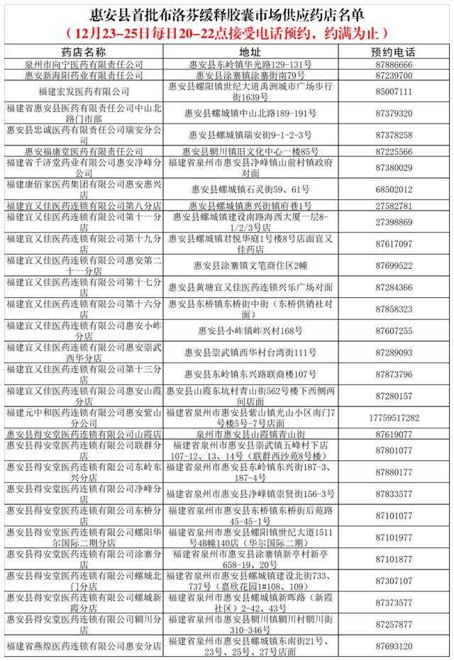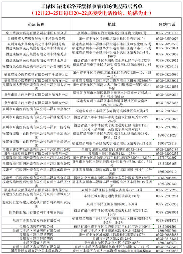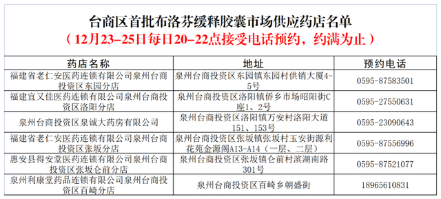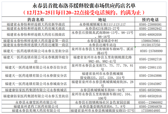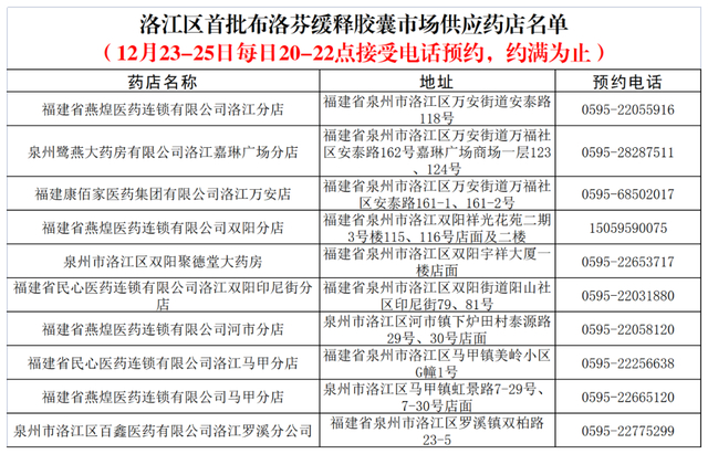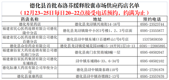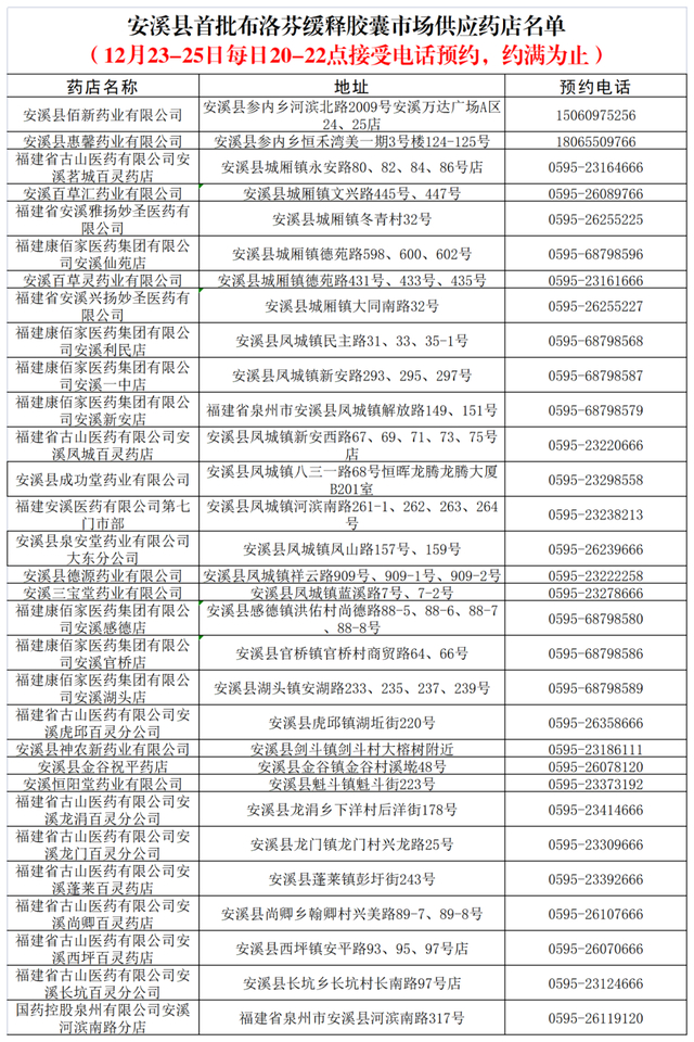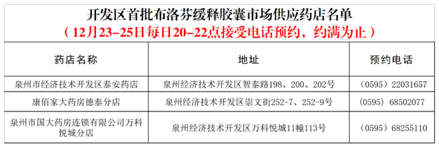 三、各定点零售药店统一采用电话预约方式销售,开放预约时间为前一天(即12月23-25日)晚上8-10点,如实登记购药者姓名、预约电话,当日限量(90人份)预约满即止,第二天凭预约电话到店购买、核销,每位顾客首批限购1次。