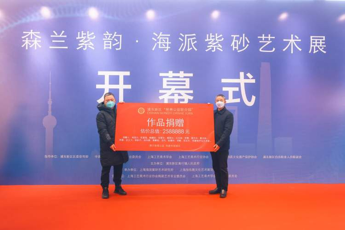 本次《森兰紫韵·海派紫砂艺术展》无论是参展作者之众,还是展出作品数量之多,均为近年来海派紫砂艺术展览之最。开幕式上,蒋国兴、陈富强、鲍曙岩等49位参展作者将总价值200多万元的作品捐赠上海市慈善基金会浦东新区分会用于社会慈善事业,展现了当代海派紫砂艺人的责任意识和社会担当。
