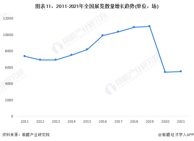 2011-2019年中国展览数量呈现波动增长趋势,2020年受到疫情影响有较大的下降。2021年全国举办线下经贸展览5495场,增长1.59%。虽低于2019年的11033场,但出现了恢复性增长态势。