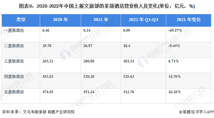 2021年,从不同星级酒店的营收规模变化看,一星级和二星级酒店2021年营收较2020年分别下降69.57%和9.44%;三星级及以上酒店营收均增长,其中五星级酒店2021年营收达到551.24亿元,较2020年增长16.16%,在三星级及以上酒店中增长最快。