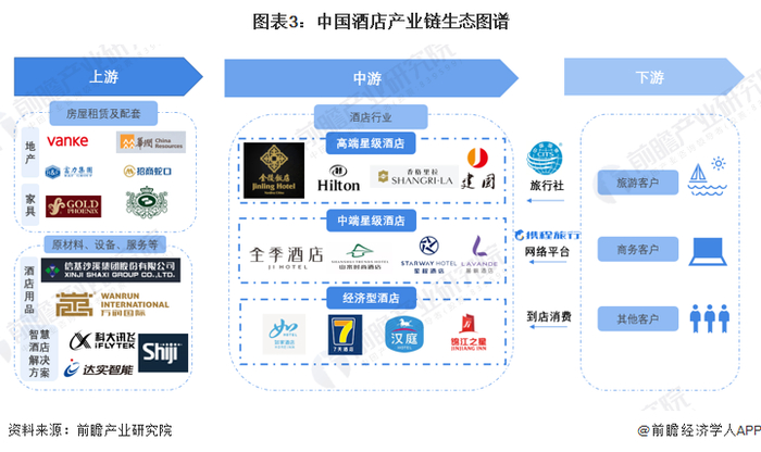 从中国酒店行业主要参与方看,上游主要包括万科、华润、富力、招商蛇口等酒店地产经营企业,还包括森源家具、金凤凰等家具生产企业,中游高端酒店主要有金陵饭店、希尔顿、香格里拉、建国饭店等,中端星级饭店主要包括全季酒店、山水时尚酒店、星程酒店、麗枫酒店等,经济型酒店包括如家、七天、汉庭、锦江之星等。酒店订购渠道主要有中国国旅等旅行社、携程等旅游酒店预订平台。