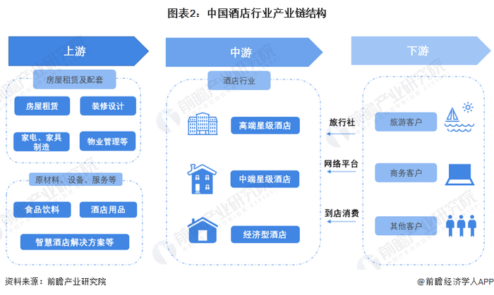 中国酒店行业产业链上游主要包括房屋租赁及配套家具等供应商,还有食品饮料、酒店用品、智慧酒店解决方案等供应商。行业中游为不同等级的酒店,主要包括高端星级酒店、中端星级酒店以及经济型酒店。下游客户包括旅游客户、商务客户以及其他客户,酒店订购渠道主要包括旅行社、网络平台或者直接到店订购。中国酒店行业产业链如下图所示: