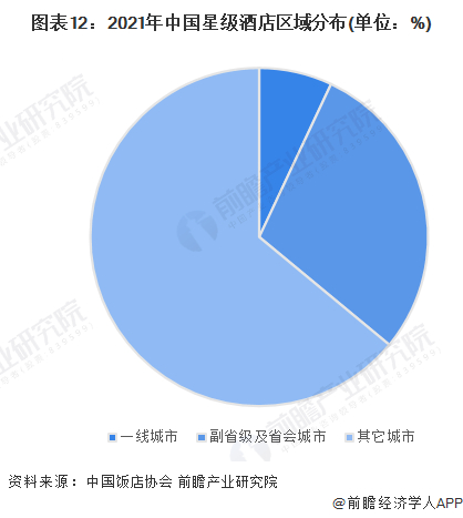 2021年中国一线城市、副省级及省会城市、其它城市这三大区域的酒店数量分别达到1.8万家、7.3万家、16.1万家,占比分别为7%、29%、64%。