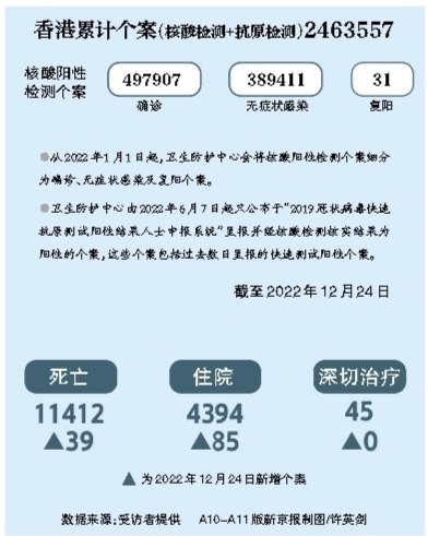 香港特区政府披露的数据显示,在2021年12月31日开始并延续至今的第五波疫情中,截至2022年12月21日,死亡人数为11076人。而在此前发生的四波疫情中,香港卫生署卫生防护中心报告的死亡病例仅为213例。