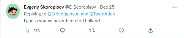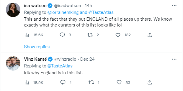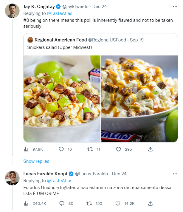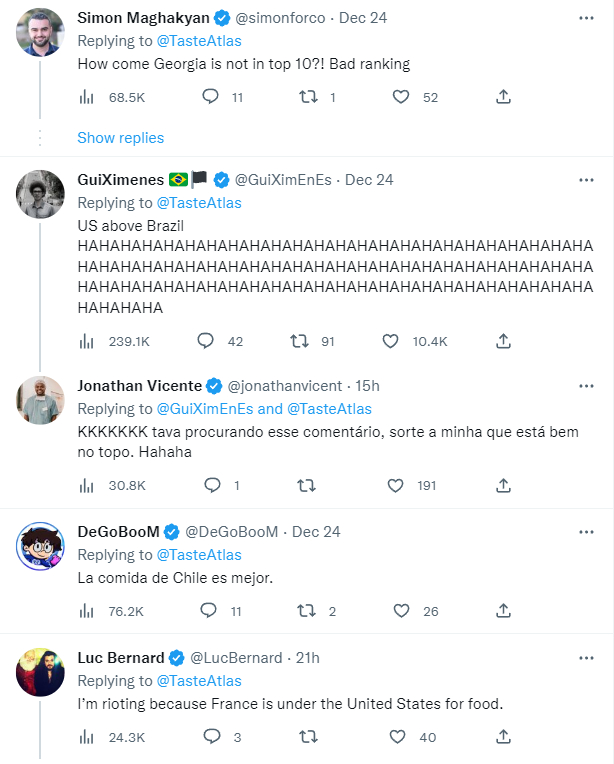 因此,当许多推特大V转发了自己对榜单的吐槽后,许多网民也纷纷在评论区表示:“看到美国排在第8名,我就觉得这榜单不值一看了”、“法国在美国之后,我要崩溃了”,还有巴西网友为自己国家的美食抱不平道:“美国在巴西前面?我要笑死了!”