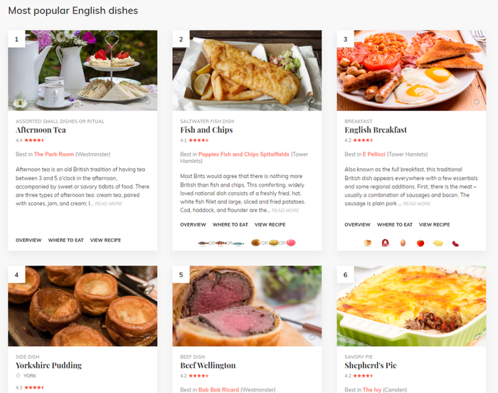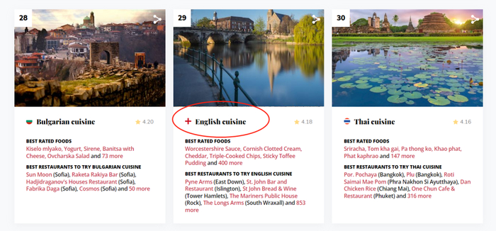 而这份榜单第二个挑战大家认知的点,则在于把广受大家吐槽的“英格兰美食”排在了第29位,位居进入榜单的95个国家的前列,而且给出的推荐菜中,有不少还是网民们公认的“黑暗料理”。