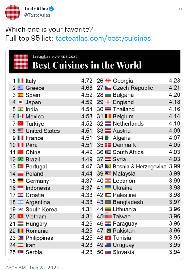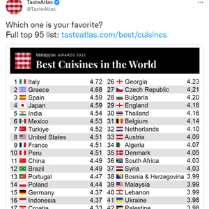 23日,著名美食点评机构“美食地图网”(TasteAtlas)发布了一份“全球美食排行榜”,然而这份名字冠以“全球”的榜单的许多内容,却让各国网民疯狂吐槽。