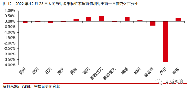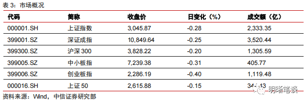 2022年12月23日,银存间质押式回购加权利率大体下行,隔夜、7天、14天、21天和1个月分别变动了-15.69bps、-1.96bps、30.20bps、-4.65bps和-2.22bps至0.55%、1.51%、2.94%、3.02%和3.00%。国债到期收益率全面下行,1年、3年、5年、10年分别变动-4.00bps、-1.65bps、-3.54bps、-2.52bps至2.23%、2.46%、2.61%、2.83%。12月23日上证综指下跌0.28%至3,045.87,深证成指下跌0.25%至10,849.64,创业板指下跌0.40%至2.286.19。