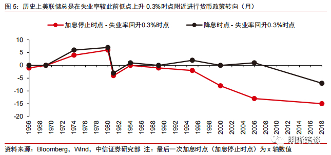 对于降息时点而言,从历史上来看,高利率下美国经济往往会时滞地出现下行风险,美联储开启降息与加息停止时点间隔往往短于9个月,因而此次美联储较难至2024年才开启降息。美联储开启降息主要取决于各维度经济数据,并且美联储降息对于失业率十分敏感,1965年以来,美联储降息时点最久滞后于失业率较此前低点回升0.3%时点6个月(见图5)。高利率紧缩货币政策下美国经济通常时滞性地放缓或恶化,导致历史上美联储维持政策利率在终点利率水平的持续时间大多短于9个月。因此,虽然鲍威尔表示美联储降息最早会在2024年发生,但我们认为美联储较难不在2023年降息。