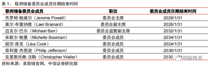 预计此轮加息周期联邦储备委员会7名成员不会因任期结束而发生变化,未来降息周期或有一名委员会成员由于任期结束而有所变动。当前联邦储备委员会的七名成员为委员会主席鲍威尔(Powell)、副主席布雷纳德(Brainard)、监管副主席巴尔(Barr)、委员会成员鲍曼(Bowman)、库克(Cook)、杰斐逊(Jefferson)、沃勒(Waller)。当前任期最短为库克,将于2024年1月结束任期,其次为布雷纳德于2026年1月结束任期。因而在此轮加息周期美联储联邦储备委员会成员不会发生变化,对于降息周期而言,若美联储降息周期包括2024年,则美联储理事库克或会在降息期间或降息前任期结束,其他成员预计在降息周期时仍处于任期中。
