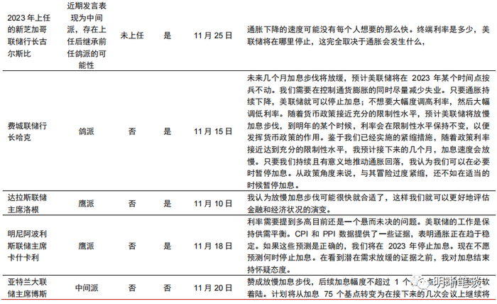 明年新票委会较2022年更具鸽派色彩。具体来看,被替换的2022年票委为四位鹰派,其中布拉德为极端鹰派代表,乔治大多时间表现为鹰派倾向(仅在6月议息会议反对首次加息75个基点,支持50个基点),梅斯特一直倾向于鹰派,柯林斯作为新任行长近期发言偏鹰派。而新2023年新票委中鹰派的仅有卡什卡利和洛根。虽然卡什卡利在2021年为最鸽派代表,但是2022年其发言具有浓烈的鹰派色彩;洛根作为新任行长表现偏鹰派,与主席鲍威尔观点相似;哈克对于过度紧缩政策的警告表现为鸽派。新芝加哥联储行长古尔斯比近期发言倾向于中间派,表示通胀下降的速度可能没有每个人想要的那么快,终端利率是多少,美联储将在哪里停止,这完全取决于通胀会发生什么,此前古尔斯比曾表示美联储的激进加息行动可能引发经济低迷,尤其是在供应限制是通胀压力背后的一个重要因素的情况下。古尔斯比此前倾向于认为高通胀一定程度由供应限制推动,因而其上任后出现较为强烈的鹰派表态的可能性较低。Bordo与Istrefi(2018)1研究表示地区联储主席可能会遵循意识形态的路线或任命者的传统,因而存在古尔斯比继承前芝加哥联储行长埃文斯鸽派表态的可能性。因此,2022年12个票委中明显鸽派的仅有1人(布雷纳德),而2023年票委中明显鸽派人数或达2-3人(布雷纳德、哈克、或包括古尔斯比)。
