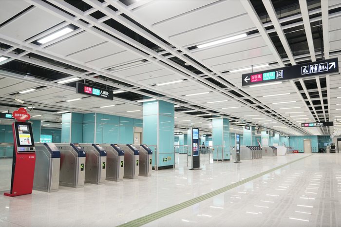 为了保障八号线西村站开通需求,五号线西村站前期同步对站厅自动售票机、自动查询机、云购票机、进出站闸机、客服中心等设备进行了整体迁移或拆除的改造施工,优化站厅布局和客流流线,方便乘客进站和换乘,并对车站天花、地板等硬件设施进行翻新,更换了站内导向灯箱和出入口门匾,使既有线车站容貌焕然一新。
