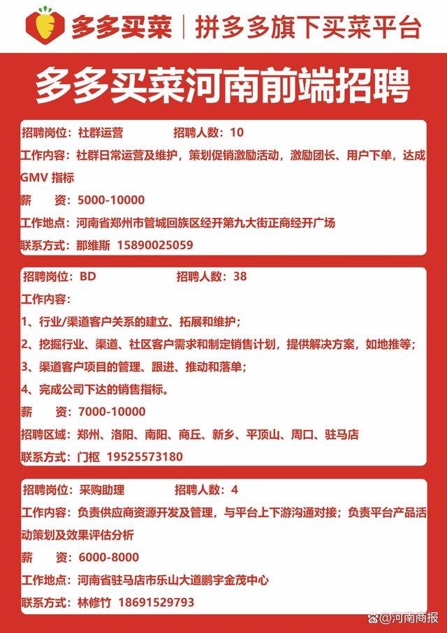 据了解,此次河南多多买菜面向全省释放上百个就业岗位,包含分拣专员、装卸专员,以及社群运营、BD等多个工种。用工地点覆盖郑州、商丘、洛阳、驻马店等全省多地市。