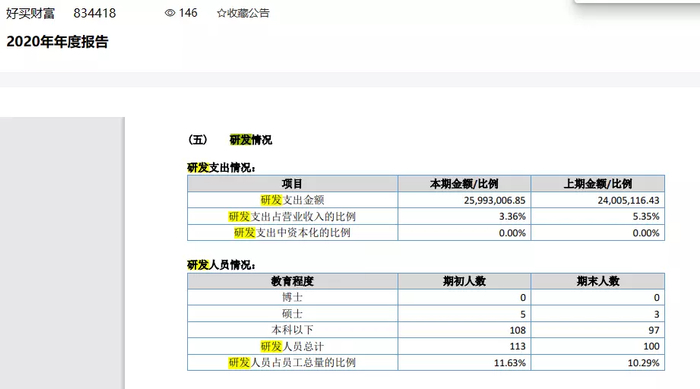 到2020年,好买财富披露了公司研发人员具体情况,其中研发人员占公司员工总量的10%左右,硕士及以上研发人员占总研发人数的3%。