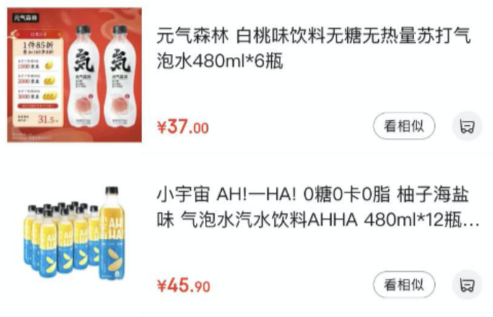 以可口可乐的“AH!HA!小宇宙”为例,在京东平台,柚子海盐味小宇宙气泡水480ml*12瓶价格为45.9元,合3.84 元/瓶,而元气森林白桃味气泡水480ml*6瓶的价格为37元,合6.17元/瓶,后者几乎是前者的两倍。