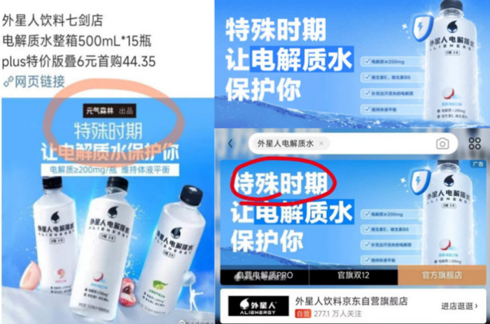 此外,元气森林官方旗舰店的KV也大打擦边球,“特殊时期,让电解质水保护你。”