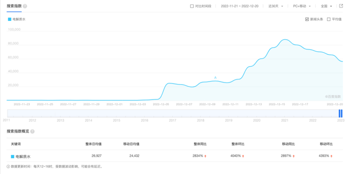 百度指数显示,2022年12月以来,“电解质水”的搜索指数扶摇直上,于12月15日达到了87862的峰值,相较于以往500左右的数值,增长了176倍。