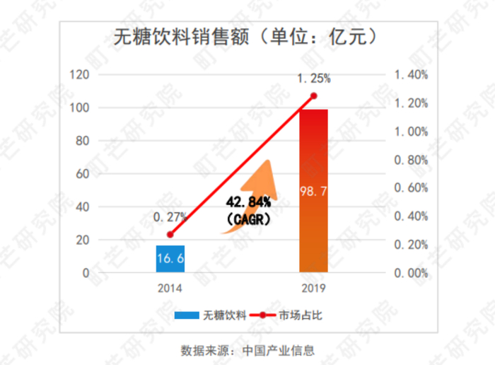 2019年,中国无糖饮料的市场规模达到了98.7亿元,复合年增长率高达42.84%,是软饮行业整体增速的九倍,占软料市场的1.25%。