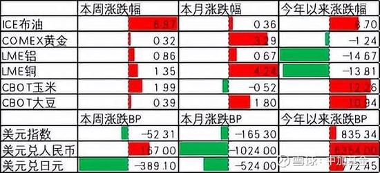 期货价格方面,上周各类期货价格整体回升,其中黄金涨幅最小,石油涨幅最大。ICE布油收于84.55美元,涨6.97%,COMEX黄金收于1806美元,涨0.32%。