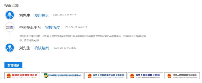 接到投诉并经信息核实无误后,中国投诉-全国缺陷产品投诉平台迅速组织工作人员与厂家沟通,投诉车主的问题很快得到了解决,刘先生也于投诉一天后在平台提交了结案。据了解,厂家为刘先生免费更换了三个车门,对于厂家的处理办法和服务,刘先生表示满意。