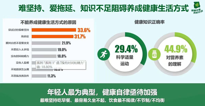 这次调查针对阻碍健康生活方式的原因进行了细致的调查。调查发现,影响因素是多样化的,其中“难坚持”及“拖延症”占比最高,分别为33.6%和31.7%。 同时,国民健康知识也明显不足,其中科学适量运动和营养素理解两项,正确率分别仅为29.4%和44.9%。