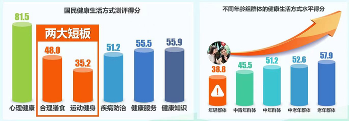 合理膳食种类不够(每天摄入12种食物的人群只有21.4%)、缺乏运动(每周150分钟中等强度运动)成为两大短板,而甫入社会打拼的年轻群体,健康生活方式得分最低。