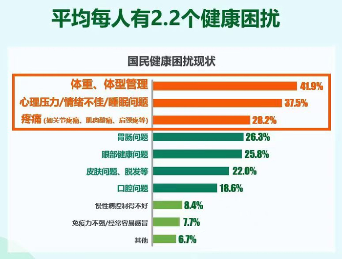 报告显示:由于不健康生活方式影响,受访者中平均每人拥有2.2个健康困扰,体重/体形管理、心理/情绪/睡眠、疼痛(关节疼痛、肌肉酸痛、肩颈疼等)问题位列前三,分别占比41.9%、37.5%和28.2%,背后则是75.7%的不良生活习惯群体占比。在快节奏、大压力下的移动互联网社会,各种不良生活习惯包括:久坐、熬夜、情绪难调、饮食无章、吸烟、饮酒等等。压力大、焦虑、沮丧、消沉等多种表现形式的心理健康问题,成为现代都市人群的一道健康难题。
