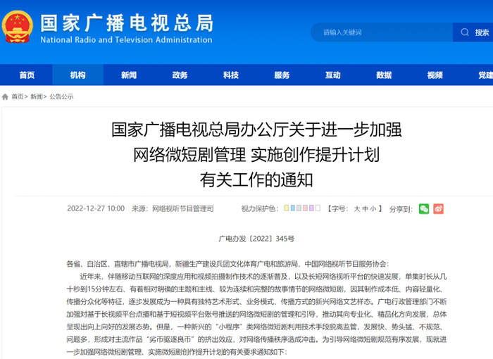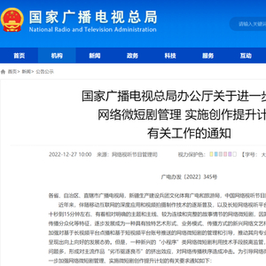 中国网财经12月27日讯 国家广播电视总局办公厅发布《关于进一步加强网络微短剧管理 实施创作提升计划有关工作的通知》(简称“通知”),其中指出,要严肃、扎实开展“小程序”类网络微短剧专项整治。
